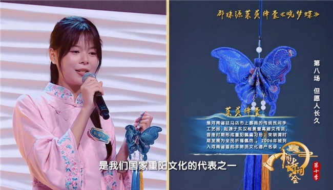 梁思成、林徽因用一生守护了文明瑰宝,而百人团的手艺人也在延续着这份坚守。古籍修复师葛益豪,以“古籍医生”自居,小心翼翼修复着被虫蛀、霉斑损伤的典籍,让李白的月、杜甫的雨,在千年后依旧鲜活如初。76岁的蛋雕非遗传承人单孟渤,用近30年光阴练就一身绝技,他带来的鹅蛋壳镂空地球仪,经线纬线最细仅0.3毫米,薄如蝉翼却经纬分明,令人赞佩。还有95后茱萸绛囊传承人邵姝源,将李商隐“庄生晓梦迷蝴蝶”的诗意融入传统技艺,制作的“晓梦蝶”绛囊,以五彩线缝就上千针,填充茱萸、白芷等药材,既藏着重阳文化的底蕴,又契合当代审美,让千年非遗有了新温度。